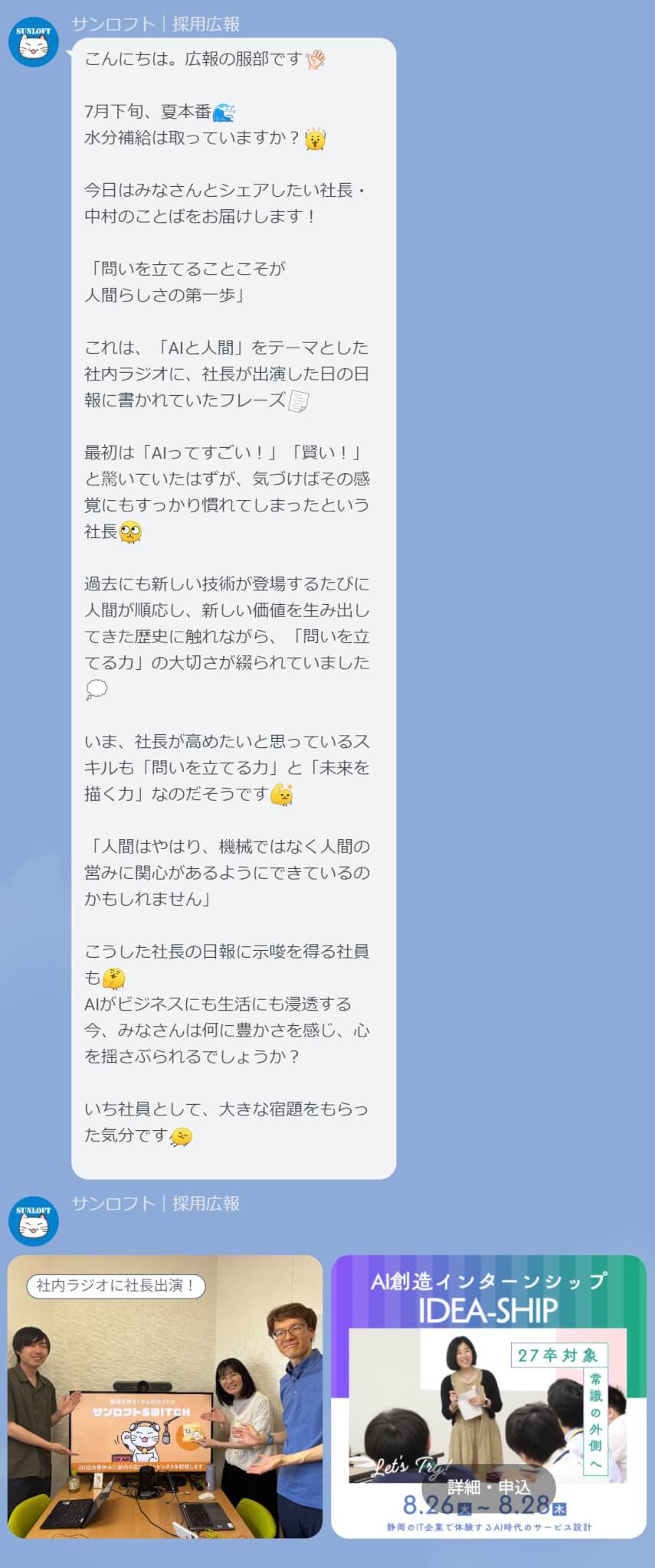 サンロフトでは、LINE公式アカウントにて社内の出来事や仕事を通して得た学び、業界・企業研究に関する話題を発信しています。