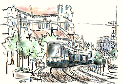 フランスのLRT半低床車。3車体連接で3ヵ所の台車の間で低床となっている、グルノーブル市ほかで稼動中。