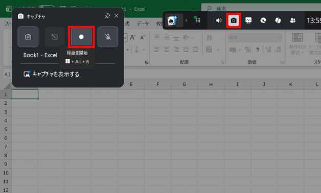 「キャプチャ」の●ボタンを押して「録画を開始」する