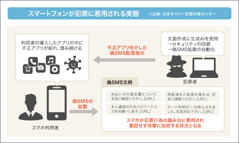 2024年に公開された内容では、犯罪者が偽のSMS(ショートメッセージ)を送信し、本文内のリンクをクリックさせて不正なアプリをインストールさせる手口が問題となっていました。この不正アプリは、利用者が気づかないうちに偽SMSをばらまき続け、感染を広げていくという仕組みでした。今回公開された2025年更新版では、こうした手口に「生成AI」が悪用されている事例が新たに確認されたと報告しています。